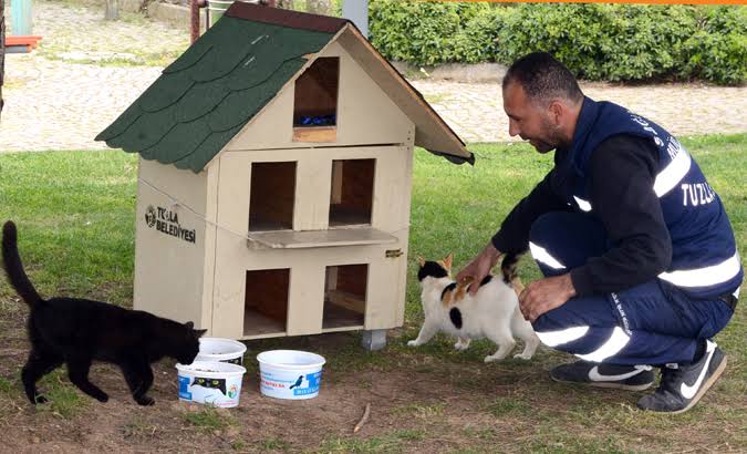 Citizens often take care of stray cats by feeding them, leaving water and food bowls on sidewalks, and even building small shelters for them during harsh weather.